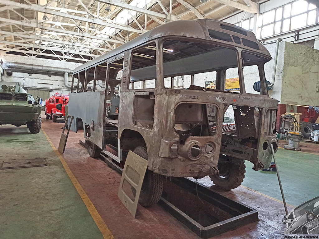 В прошлой части мы остановились на проблеме с изготовлением угловых скатов крыши, из-за которых работы с «пазиком» застопорились на несколько месяцев. Вот в таком виде – разутый и раздетый, с зияющими дырами в крыше, в окружении зеленых БРДМов и «пожарки» ПМЗМ-1 Военно-технического общества – он встретил 2020-й год и отстоял всю пандемию, когда приезжать к нему через закрытую Москву все равно было невозможно.