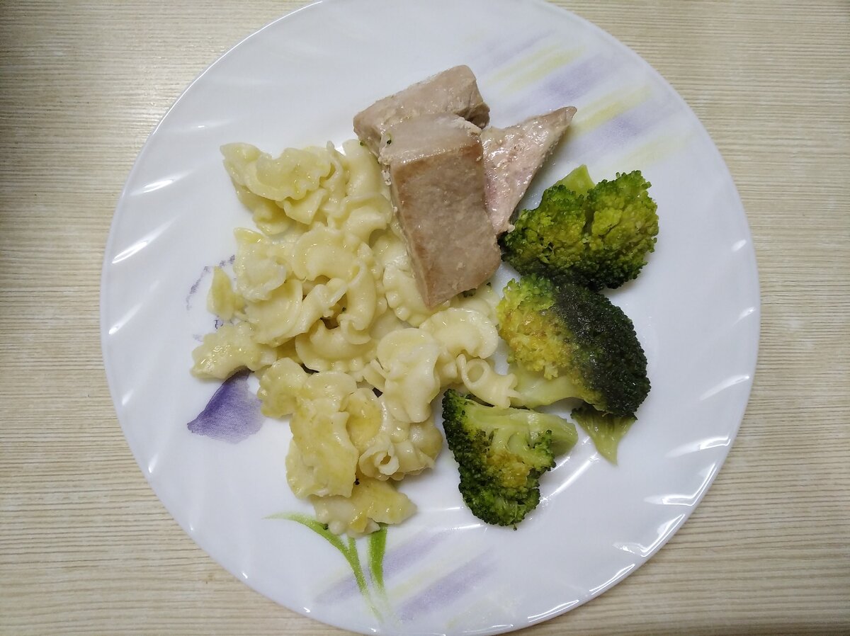 6. финальный этап - сливаем пасту и заправляем маслом, выкладываем на тарелку вместе с тунцом и брокколи. При желании добавляем любимый соус, зелень или тертый сыр.