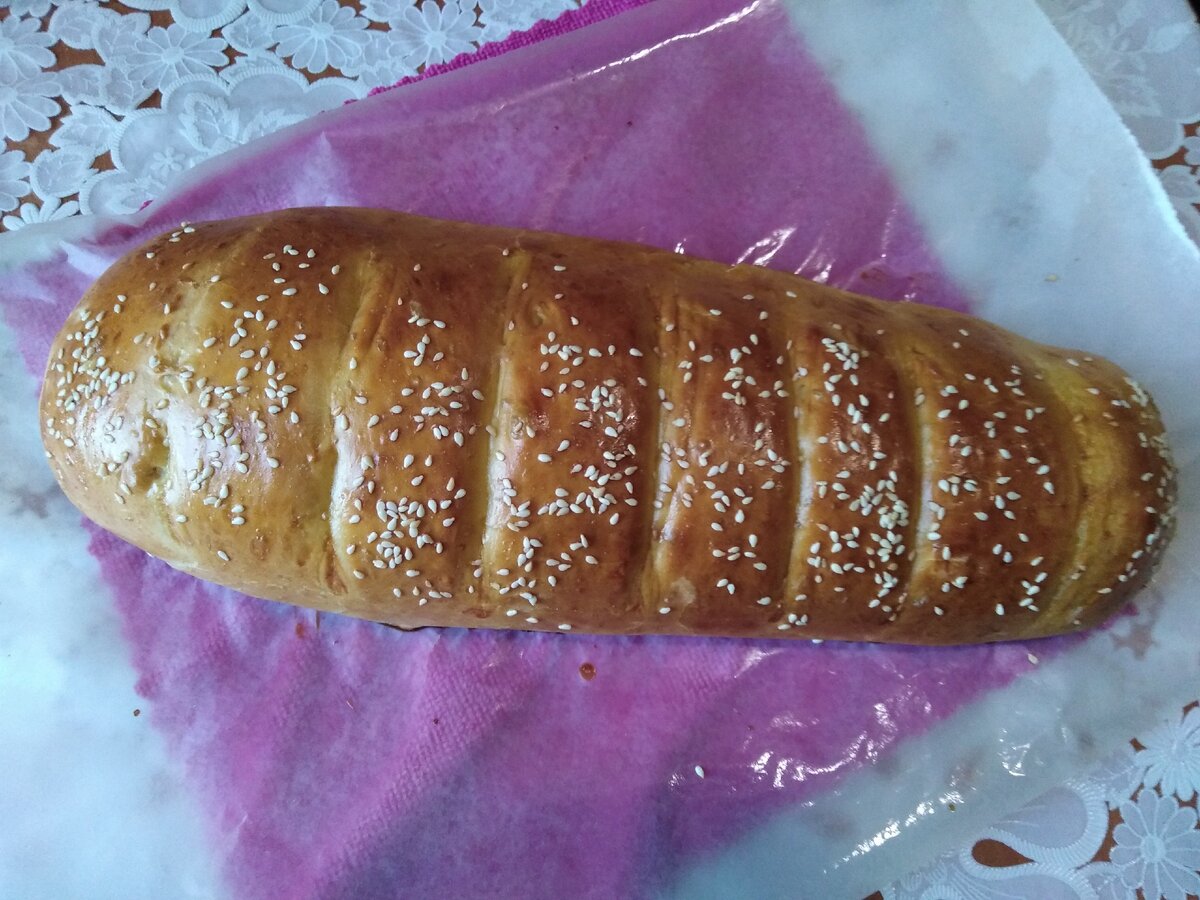 После чего, я его обминаю и формирую в виде батона, делаю надрезы и смазываю яйцом, можно украсить кунжутом.
