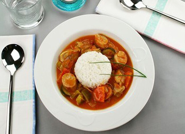4. Разогрейте оливковое масло в сковороде, отправьте жариться лук с чесноком на медленном огне – 2 минуты, потом добавьте помидоры и готовьте еще 5 минут. Потом отправьте на ту же сковороду кабачок, посолите, закройте крышкой и готовьте, иногда помешивая, 35 минут. Добавьте рис, перемешайте и сразу подавайте.