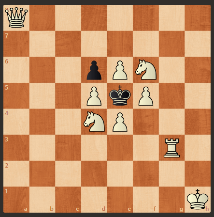 Очередная шахматная задача. Автор Л. Саркиц, 1963 год. Черный король окружен четырьмя белыми пешками. Черный король напал на двух белых коней. Однако белые начинают и ставят мат в 2 хода. Как выиграть в равной позиции, смотрите в следующей задаче тут>>>>