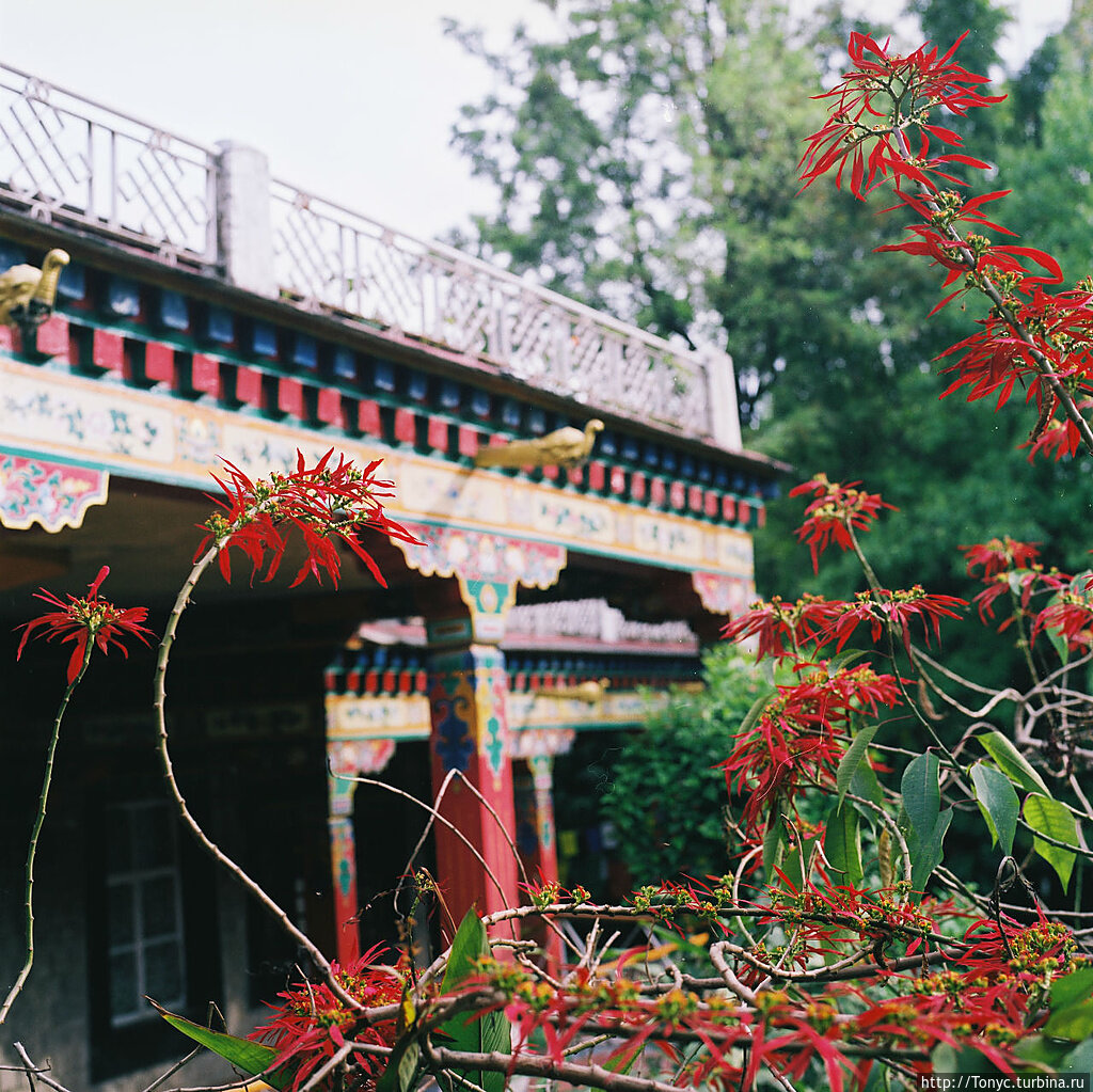 Рядом с городом находится Центр где живет и работает Далай-лама, когда не разьежает по миру. А ездит он много, его никогда тут не бывает, то есть очень трудно застать в его же резиденции. А вот остальные тибетские монахи живут и учатся здесь почти безвыластно.Тибестский монах зажигает