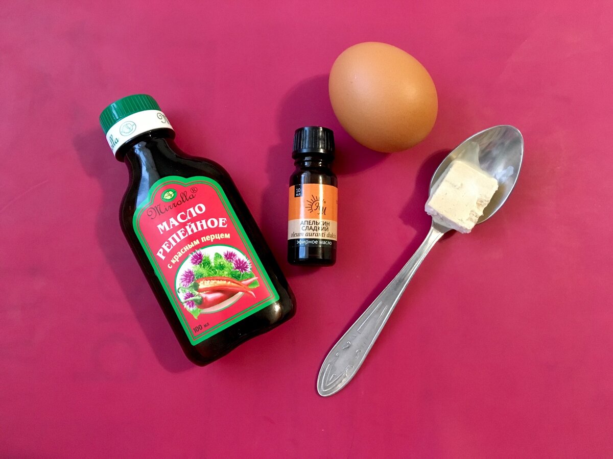 Для приготовления маски мне понадобится: репейное масло, любое эфирное масло (у меня апельсин), дрожжи и желток.