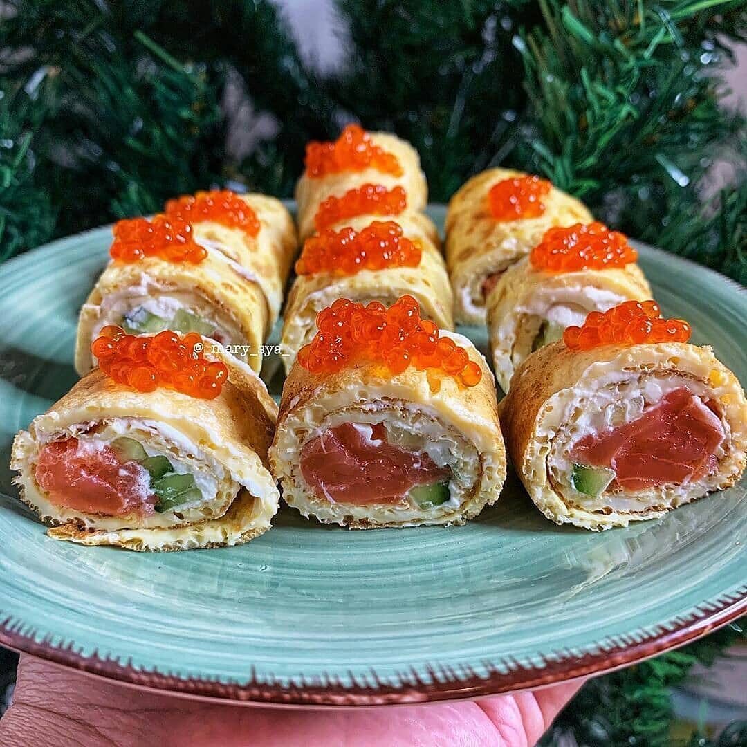 Далее намазываем блинчики творожным сыром, кладём тонко порезанный огурчик, рыбку. Сворачиваем в рулет. Нарезаем на кусочки и украшаем красной икрой.