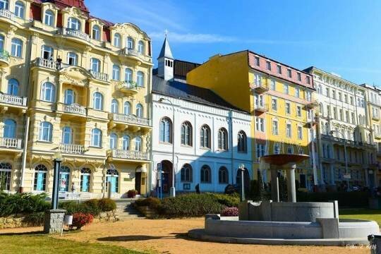 Евангелистская церковь на курорте Марианске Лазне кажется скромной и неприметной по соседству с помпезными барочными зданиями ярких оттенков. Она возведена рядом с пятиэтажными домами, но сама при этом имеет только два этажа и небольшую башенку, которая не поднимается над крышами, а располагается вровень с другими постройками. Но это не умаляет ее значимости для
