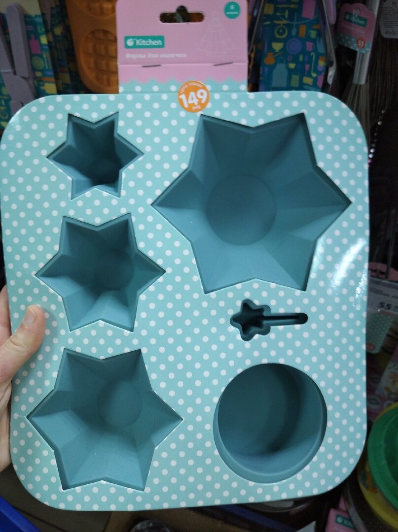 В силиконовую формочку входят шесть ячеек разных конфигураций и размеров. Как показано на обратной стороне упаковки, из полученных кексов можно сделать елочку, которая станет праздничным украшением к вашему столу.