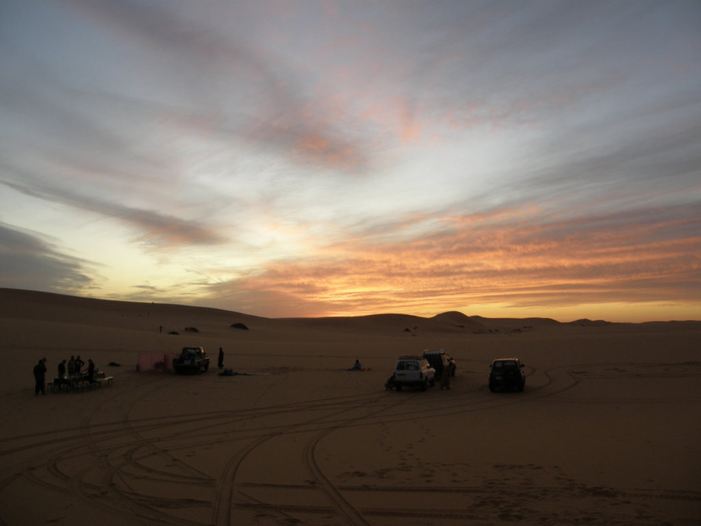Светлая песчаная пустыня гораздо приятней каменистого панциря. Водитель джипа, отъехав примерно 15 км. от города снижает скорость, и начинает внимательно вглядываться на обочину, затем, увидев следы уходящие в пустыню, движется по ним. Через какое-то время мы останавливаемся у палаточного лагеря. Повар с напарником к нашему приезду уже установили длинный стол и лавки, предлагая попить чаю. А ужин из макарон, состоялся при свечах, которые постоянно задувало ветром, и завершился в полной темноте.Ах какой в тот вечер был закат ! Огромная, бархатистая масса песка переливалась каждой своей частичкой в лучах уходящего солнца. После заката солнечного диска, западная половина неба словно дразнила потемневшую восточную апельсиновыми, мандариновыми и морковными отблесками, но мрак наступал. Поддерживая темноту зазвездилась Венера, после, в хаотичном порядке зажигались уже сами звёзды, и, вот, караванной тропой нарисовался млечный путь, чиркали кометой падающие метеориты.
