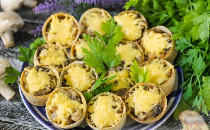 - Как только сыр расплавится и подрумянится - ваше блюдо готово. Переложите тарталетки с противня на блюдо, дайте им слегка остыть и подавайте теплыми на стол, украсив свежей зеленью.