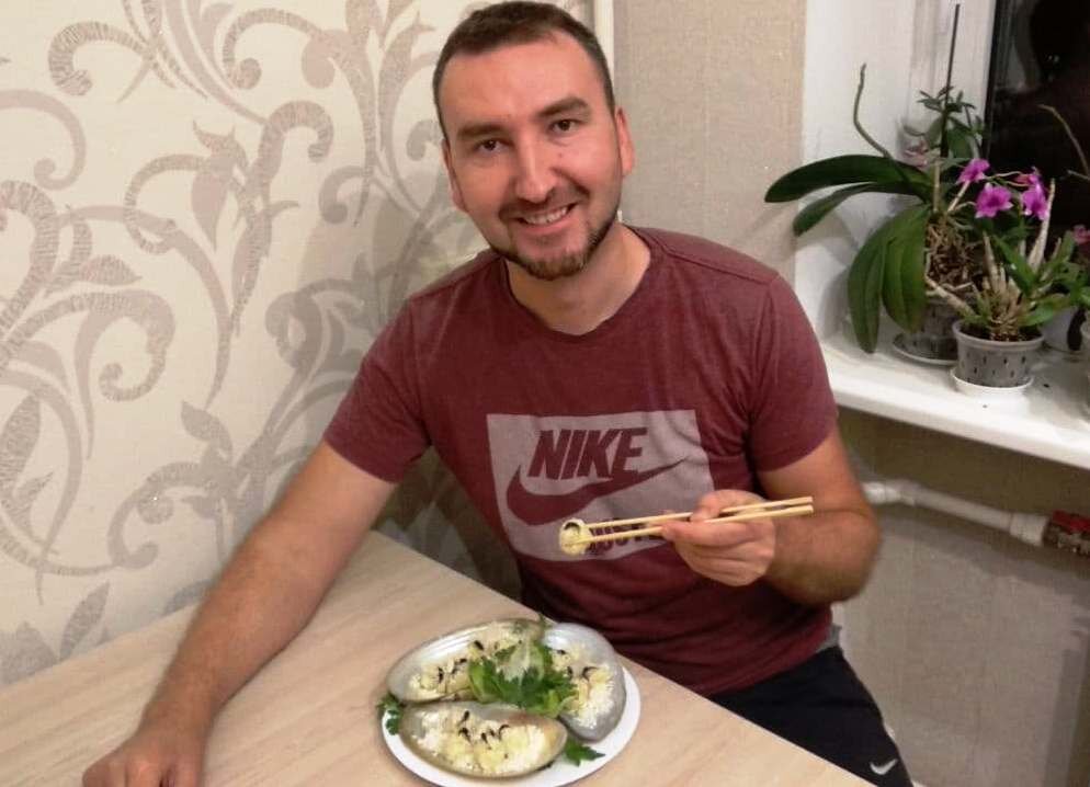 Обратной стороной палочек делаем в шариках углубления, куда будет вставляться мидия. А потом вставляем мидии: