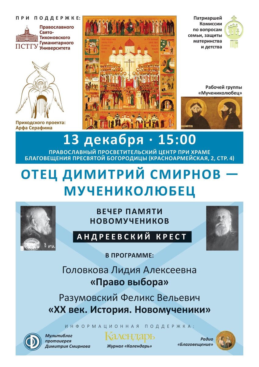 13 декабря 2020 года, в 15:00 в Православном просветительском центре при храме Благовещения Пресвятой Богородицы состоится вечер памяти новомучеников. В программе: Лидия Алексеевна Головкова с докладом "Право выбора" и Феликс Вельевич Разумовский с докладом "ХХ век. История. Новомученики" http://www.dimitrysmirnov.ru/blog/mozaika-103964/