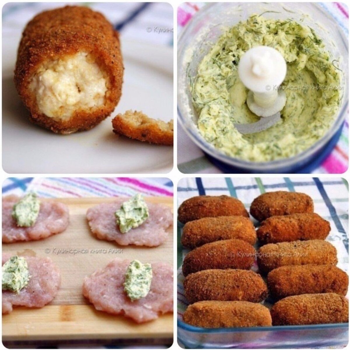 Сначала сделаем начинку. Для этого потребуется слив. масло, укроп и чеснок. Укропа и чеснока возьмите по вкусу. Можно все мелко порезать и смешать с маслом, а я все смешала в блендере. Уберем пока в морозилку и займемся фаршем. В готовый куриный фарш добавить соль и перец по вкусу. Хорошо вымешать. Разделить фарш на десять кусочков, сделать из них колобки, затем расплющить их в лепешечки (руки смочите водой, чтобы фарш не лип). На каждую лепешечку положить по ложечке начинки. Кстати, в качестве начинки можно использовать и сыр, и грибы. Смоченными руками сформировать котлетки. Теперь панировка. Панировка должна быть толстой, поэтому.