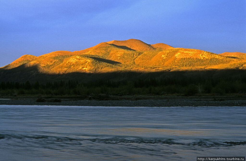 Однако ежедневные упражнения по переноске тяжестей дают себя знать. Есть некоторые проблемы со здоровьем. К тому же у Виктора, по непонятной причине, распухла десна, так что он практически не мог разговаривать. Вид напарника некоторое время был весьма плох и вызывал сочувствие. Да тут ещё в самом апогее этого состояния, в один из дней, вляпались в такое жуткое и затяжное болото. Идти по дороге получается с большим трудом, остановиться и отдохнуть негде. А в стороне от дороги ещё хуже. Когда пришло время, никак не могли подыскать приемлемое место для стоянки. И всё же повезло в этот день. Обнаружили рядом с дорогой небольшую сухую полянку под двумя большущими лиственницами. Здесь же небольшой распадок, в котором бьёт родник с вкусной и холодной водой, прямо из под корней дерева. Это место как-то сразу показалось чудотворным. Оно вызвало приятные ощущения не только визуально, но и где-то на подсознательном уровне. И действительно, с этого дня мой товарищ пошёл на поправку. Привожу координаты этой стоянки — 62º56´,389 северной широты и 140º27´,223 восточной долготы. К тому же Виктор поймал этим вечером нескольких хариусов на Сунтаре, который протекает здесь совсем недалеко от дороги. А мне удалось поймать несколько моментов с редким вечерним светом. На противоположном берегу Сунтара здесь очень примечательное место. Огромное поле выносов из долины реки Сыатынья. Само устье этого правого притока расположено чуть ниже. Здесь же Сыатынья разгружается в паводки и выносит большое количество твёрдого материала, от песка до очень крупных камней. Какая-то часть материала выносится в Сунтар, поэтому тут его русло очень узкое. Дальше и дорога пошла гораздо лучше. Следующая ночёвка оказалась на берегу небольшого ручья. Здесь надпойменная терраса очень узкая. Река рядом, а с другой стороны дороги, почти сразу же, начинается крутой склон горы. Этим решил воспользоваться и поднялся наверх. Торопился успеть поработать до того, как солнце уйдёт за гору. Весь взмок, пока бежал по крутому склону, усыпанному крупными глыбами камней. По пути, среди камней, встречались многочисленные кусты каменушки, богато усыпанные вкусной ягодой. Приходилось на ходу срывать её и горстями запихивать в рот. Как-нибудь расскажу о ней подробнее. Красота! Здесь долина реки меняет своё направление. То мы шли на юго-запад, теперь предстоит идти на юг. Точка обзора оказалась очень выгодной. Видны все части реки. И те, что уже прошли, и те, что ещё предстоит пройти, кроме самых верховьев. Под нами остатки огромной наледи в расширенной части русла Сунтара. Она явно доживёт до зимы. А на заднем плане заснеженные горы Сунтар-Хаята. Вот и узнаваемые вершины – Палатка и Мус-Хая.