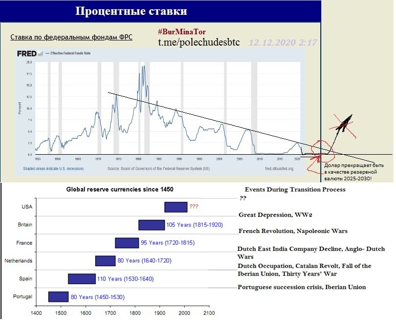 Если провести трендовую ставки Фед. Резерва, то она дойдёт до пола (околонулевых значений) именно в эти года. Пробитие трендовой и шоковый рост ставок- как следствие борьбы с мощной инфляцией, которая будет только нарастать определит какой то *здец к концу третьего десятилетия! Может кто то слышал про Варбургов и их планы к 2027 году?)))