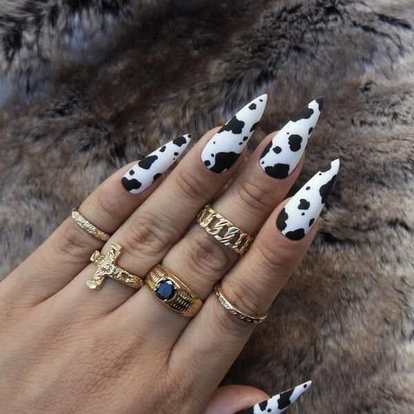 Маленькие черные пятнышки на белой основе великолепно смотрятся и на коротких ногтях естественной формы, и на длинных. Часто в качестве фона мастера нейл-арта используют не белый, а молочный или бежевый цвет, голубые, нежно-розовые оттенки.