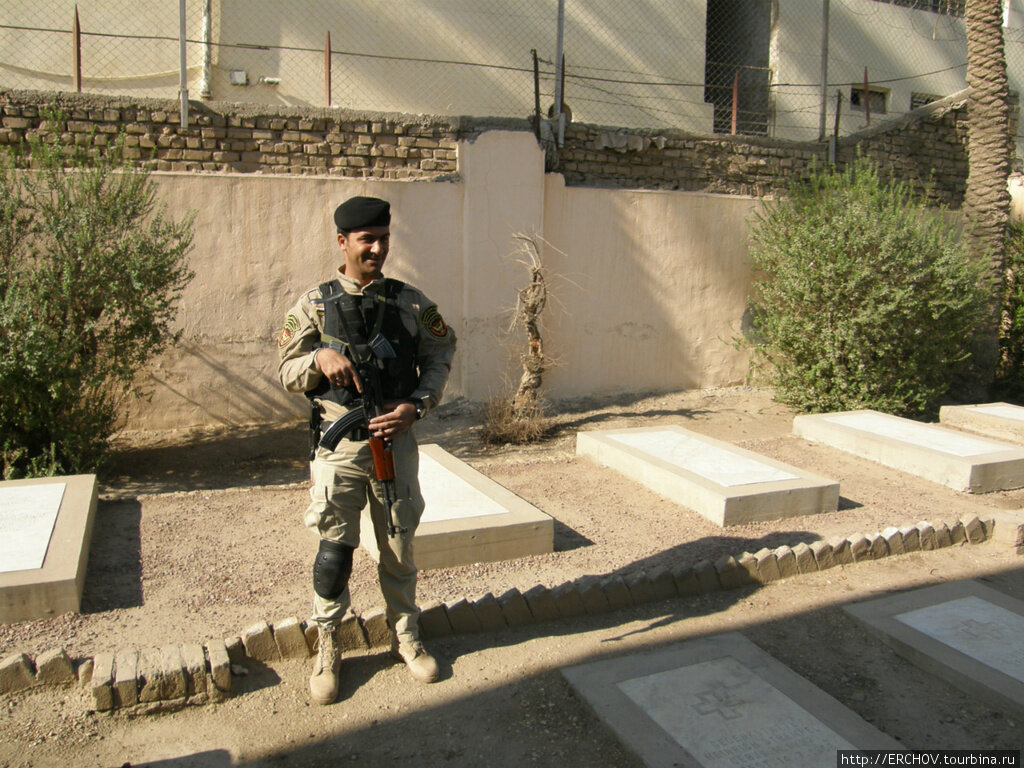 Утром после некоторых споров с нашими гидами нам удалось выработать определённый маршрут по городу. Омар предлагал большую часть времени посвятить ещё одному базару, но нам хотелось посмотреть что-то архитектурное. После в 14 часов на одном из рынков произошёл взрыв, поэтому спасибо старшему нашей группы Сергею за его туристическую мудрость. Садимся в автобус и с ужасом вспоминаем, как мы в первый день передвигались по багдадским пробкам. Сегодня воскресенье 6 ноября – закончился хадж. Такой день считается праздничным, и город был пуст. У российских мусульман такой праздник называется Курбан-Байрам. Машин совсем мало. Джип с охраной традиционно впереди. Один парень уже сопровождал нас впервые дни. Он искренне обрадовался встрече. Проезжаем закрытую на ремонт армянскую церковь. С другой стороны в этом квартале находится немецкое кладбище. Входные ворота похожи на вход в обычный арабский дом, а за высоким забором некий кусочек Германии. При кладбище живёт семья, ухаживающая за могилами. Смотрим на могильные таблички. Весь двадцатый век здесь хоронили немцев, в большинстве своём военных.