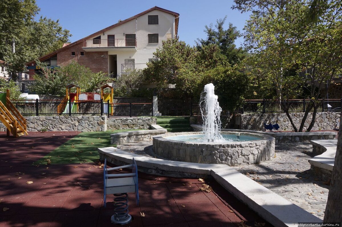 Проезжая над деревней, мы успели заметить, что сверху дома, тыльной стороной упирающиеся в скалы, кажутся одноэтажными, но оказавшись рядом с ними, впечатление кардинально меняется, просто первые этажи расположены ниже уровня дороги. Кроме светлых миниатюрных домиков местных жителей, там достаточно построек покруче, этаких дачных особняков, больше напоминающих маленькие дворцы. И неудивительно, ведь в начале XX века при англичанах, дерзнувших оттяпать территории под военно-морские базы, а фактически получивших право управления островом, здесь было полно резиденций для особ королевских кровей, ученых, литераторов и поэтов, словом для «сливок» общества. С тех самых пор, оценив прелесть здешних мест, кипрская знать (да не только кипрская) предпочитала этот горный курорт, где можно в тени сосновых лесов укрыться от изнуряющей летней жары, раскаленному побережью.Настоящий туристический бум произошел здесь в 2-ой половине прошлого века, когда активизировалось развитие инфраструктуры в деревне. Кроме таверн и ресторанов здесь начали расти как грибы после дождя звездочные гостиницы высокого уровня, с саунами, теннисными кортами и ипподромами.