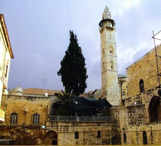 От Храмовой горы, где сверкает Купол Скалы, мечеть Омара находится довольно далеко. Стоит она прямо напротив Храма Гроба Господня, её пятнадцатиметровый прямоугольный в плане минарет отлично виден со двора Храма.