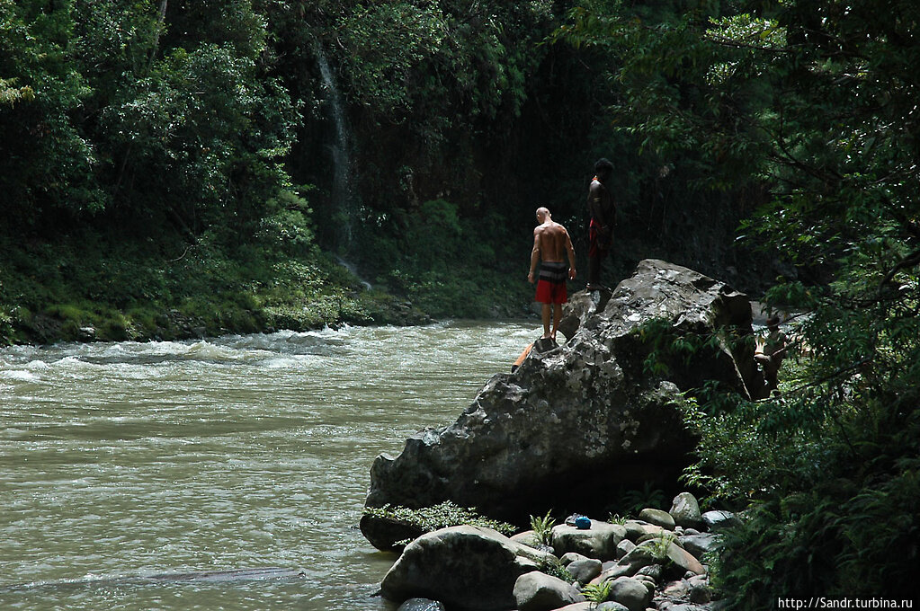 Но тут Юко делает последний рывок, вырывается из объятий сильного течения и хватается рукой за громадный камень, который стоит прямо на противоположном берегу. Пловец ловко забирается на него, переводит дух. Теперь Юко ждет другого папуаса, который повторяет за ним рискованный трюк. Ко второму экстремалу судьба так же благосклонна. Поэтому теперь оба победителя могучей Ей стоят на трехметровом валуне похожим на батон, который ели руками. Так папуасы демонстрируют нам место, где люди Вано добывают материал для своих топоров.
