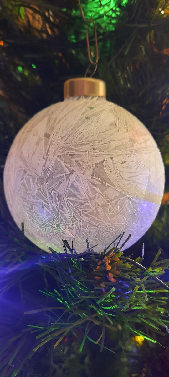 Оставшийся в живых белый шар пощадило время и спустя 27 лет он красуется на нашей с детьми елке. К слову, этот морозный узор и мою пару завораживает.