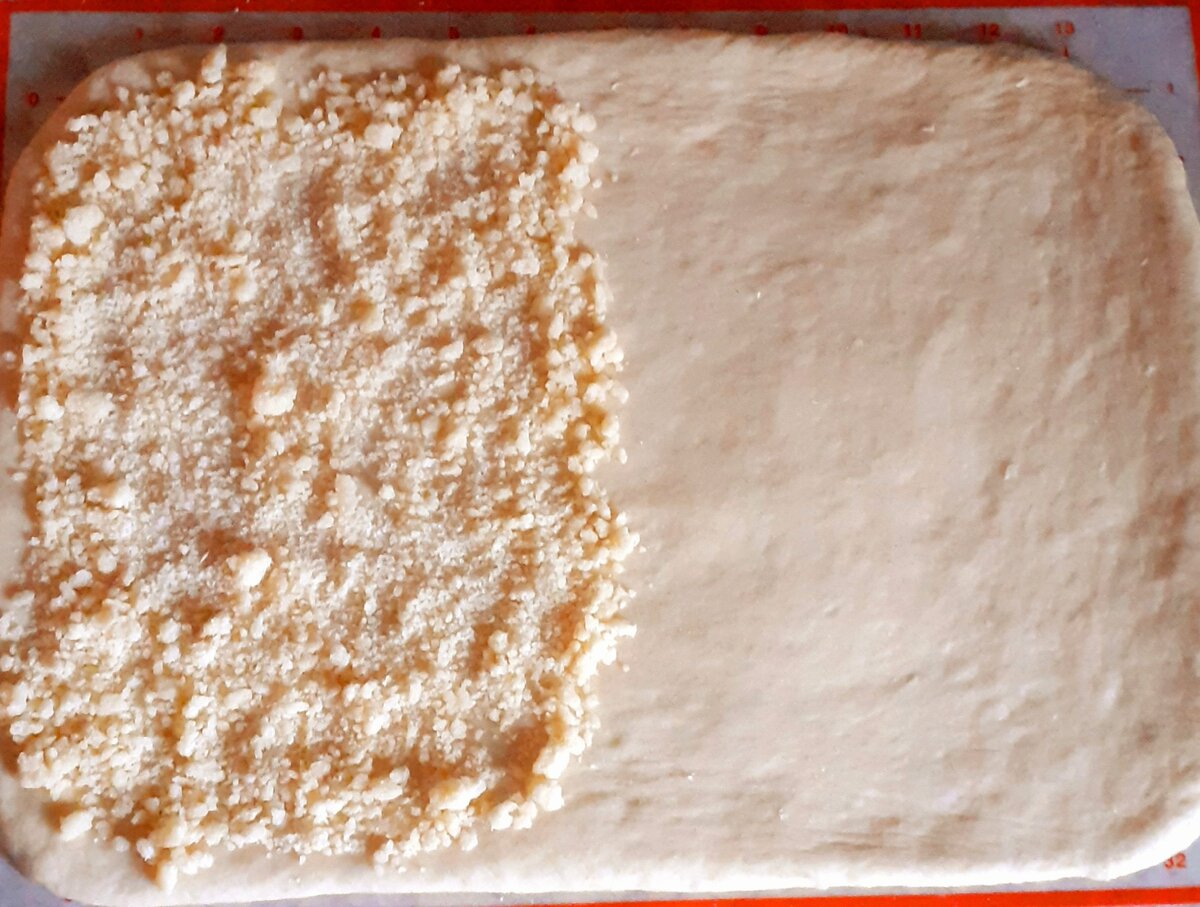 5. Раскатать тесто в прямоугольник,на одну часть поливины распределить сахарную крошку( штрейзель).