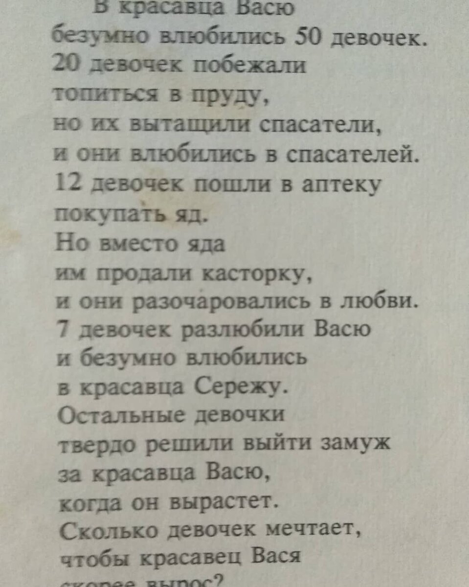 Интересно, о чем думал этот человек, который составлял эту задачу. Судя по всему в этот момент у него был очень сложный период в жизни.