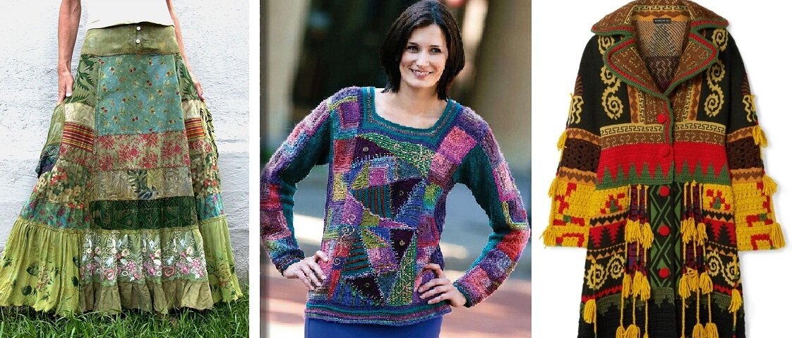 Эта стильная одежда, сильно походя на этническую, таковой не является, так как во вех странах в прошлые времена люди шили из оставшихся кусочков ткани самые разные изделия - одежду, сумки, одеяла, салфетки и т.д. Именно поэтому эти изделия в одежде создают уникальную атмосферу уюта, тепла и защищенности.