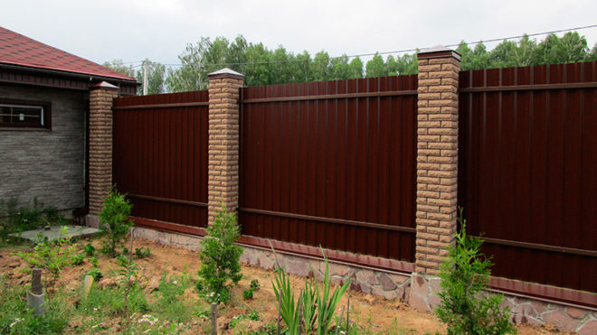 Металлические профилированные листы, закрепленные на опорах, создают по периметру участка сплошной ряд ограждения. Прочный и долговечный, не уступает в этом кирпичным заборам. Но стоит дешевле. Это стальной оцинкованный лист с волнистой поверхностью. Существует несколько видов профлиста: