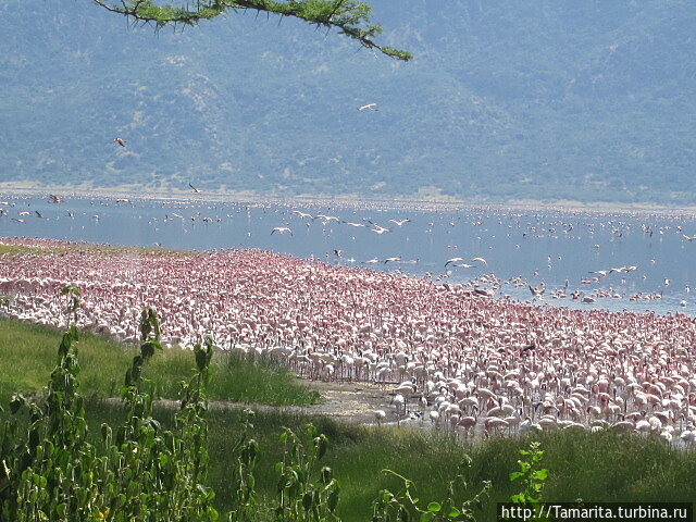 А гейзеры? Оказалось, что озеро поднялось от прошедших дождей и гейзеры не столь высоки, как думалось. Некоторые из них находятся в самом озере и фламинго грелись в их тёплых потоках, вышагивая по кругу сучковатыми лапами.