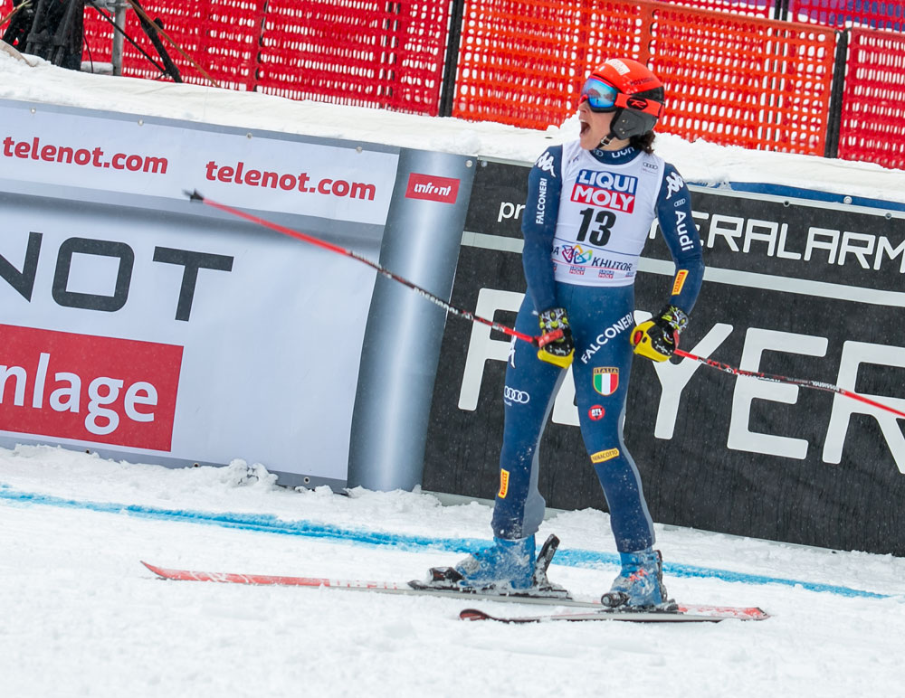 Федерика Бриньоне уходит на трассу. На разгоне остается в красной зоне, но уступает всего 3 сотых. Дальше попадает в облако, и ошибается на одном из виражей, Феде уступает 32 сотых на втором отрезке, а на третьем – сразу 1.37 секунды, это четвертое место. И только пятая Федерика внизу! Ничего себе, причем проиграла Влховой 1.64 секунды.
