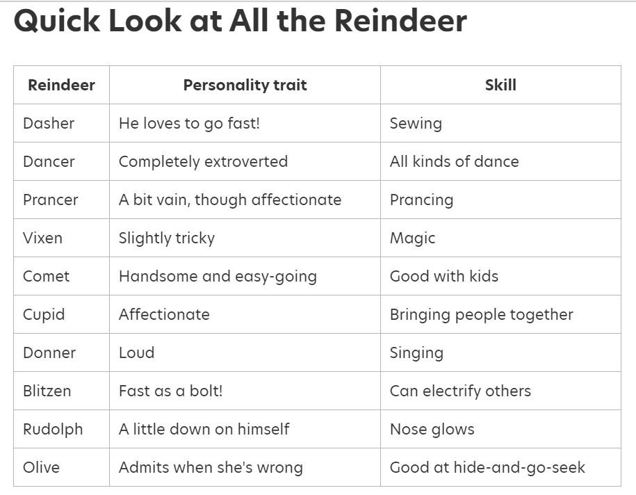 Dancer is a reindeer with a unique personality. He’s completely extroverted. When he’s not helping Santa, he’s having dance parties.