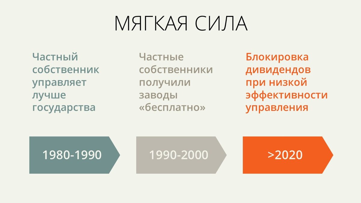 Таким образом, собственники компании вынуждаются к тому, чтобы либо назначить правильный менеджмент, либо продать актив по дешевке. Во втором случае будет происходить балансировка капиталов, но не между собственником и государством, а между старым и новым эффективным собственником. Новый собственник появится лишь в том случае, если ему будет гарантирована высокая прибыльность. Последнее возможно или за счет инновационных идей, или выкупа бизнеса по дешевке.