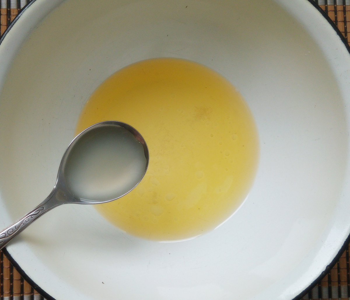 1.В миске на водяной банке раскаляем сливочное масло до жидкого состояния. Затем слегка остужаем его и вливаем чуть больше стакана творожной сыворотки.