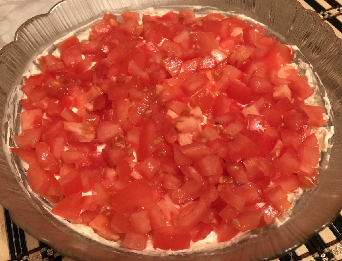 Сверху выкладываем кубики красного помидора. Помидор порезать и обязательно слить весь сок который он выделяет.