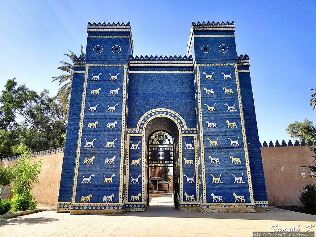 Здесь мы увидим копию ворот Иштар. Всего в Вавилоне было восемь ворот, последние были украшены глазурованным кирпичом и барельефами львов, быков и драконоподобных существ — сиррушей (мушхушу). Роберту Кольдевею удалось раскопать богато украшенные ворота Иштар и вывезти их в Берлин. В 1930-х гг. ворота были реконструированы из найденных фрагментов и установлены в Пергамском музее в Берлине. Размеры восстановленных ворот Иштар — 14 метров в высоту и 10 метров в длину.