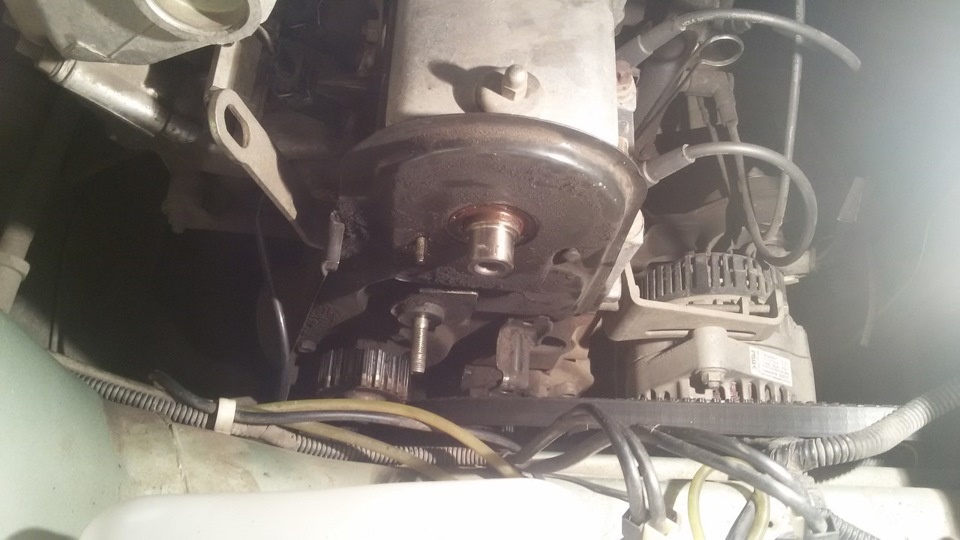 После чего я накинул ремень ГРМ и посмотрел, чтобы первый зубчик после прорези на шкиве зажигания совпадал с ремнем ГРМ.