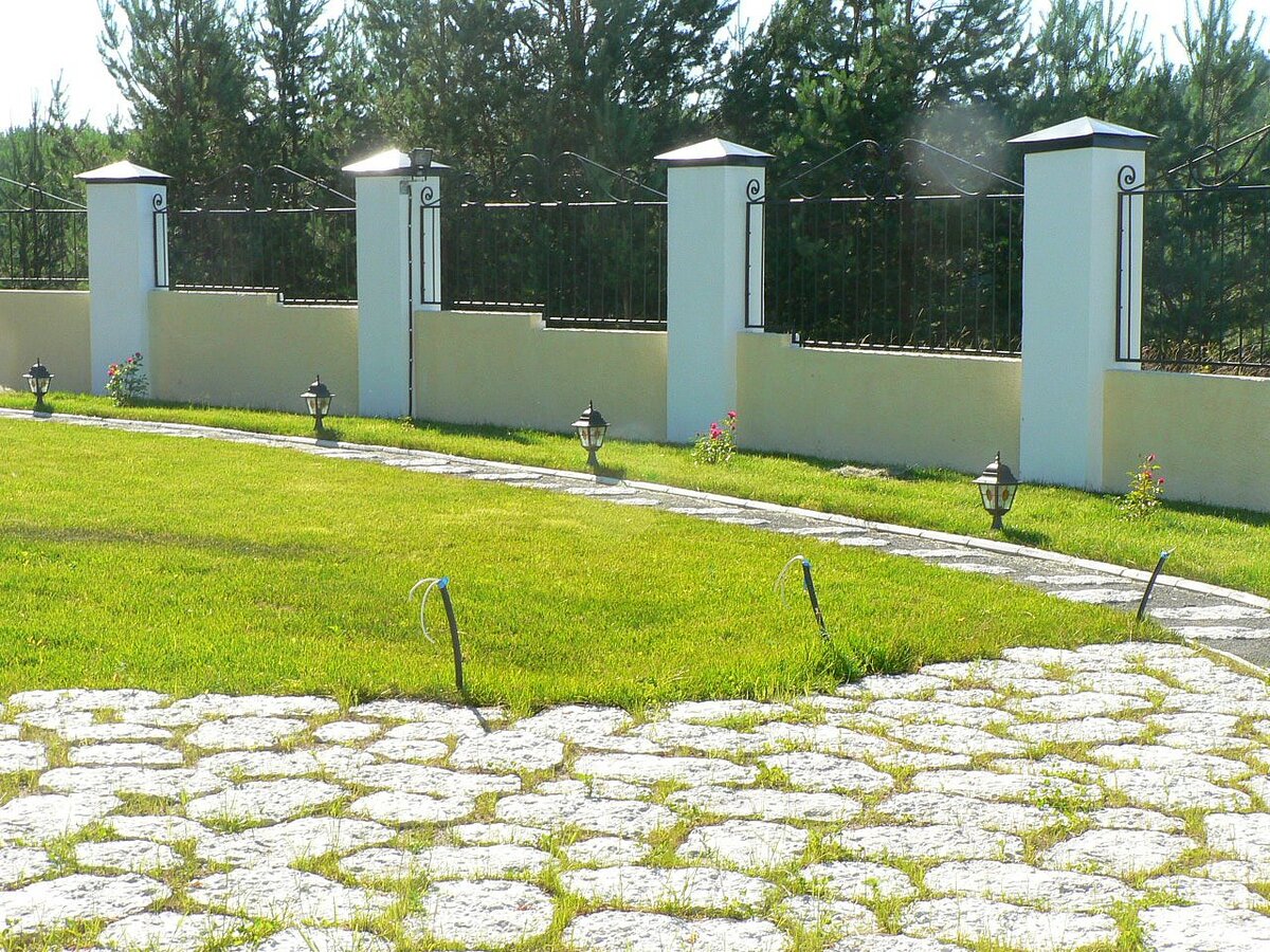 А еще иногда хочется, что забор открывал вид, допустим, на реку. Тогда можно менять его высоту. На фото ниже - забор кирпичный, поэтому мне легко было сделать его вот такими уступами. Таким образом мы открыли красивый вид, вставив на небольшом куске ковку.
