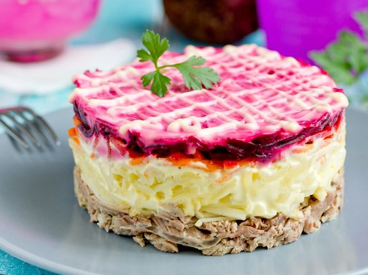 14) Финальный штрих - нарисуйте на поверхности салата майонезную сеточку.