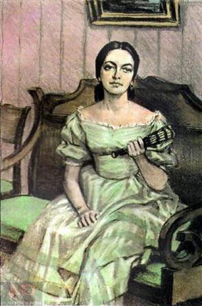 - ПОРТРЕТ: "...Женщина высокого роста, в чёрном платье..."; "...Достойная осанка..."; "...Стройный стан..."; "...Блестящие волосы..." "...Покатые плечи...";