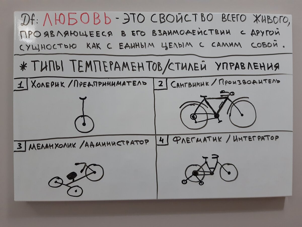 * Консультант: Да, именно. Они отличаются по скорости, отношению к человеку, с которым они взаимодействуют и так далее. Первый тип (холерик, предприниматель) - одноколёсный велосипед. Как в цирке. Очень быстрый, но цели особой нет. Постоянно в движении, в любую секунду может поменять направление на любое из трёхсот шестидесяти градусов. Если спросите про риски для сидящего на нём человека, то ответ одноколёсного будет - “Не знаю, что такое риски, но точно будет весело!”