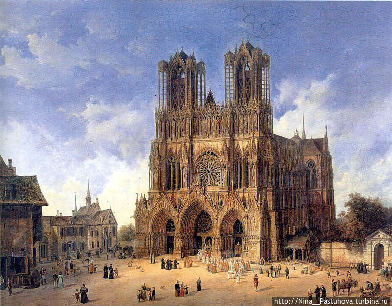 Реймский Cathédrale Notre-Dame известен гораздо меньше, чем Собор Парижской Богоматери, хотя внешне они очень похожи, но последний стал известным благодаря одноимённому роману Виктора Гюго. Для истории же Франции большее значение имеет Реймский собор, так как здесь в течение нескольких веков короновались французские монархи.Собор имеет длинную историю и начинается она ещё в 401 году, когда был построен первый романский храм, но он был уничтожен огнем во время пожара 1210 года. Поэтому в 1211 году на его месте было начато строительство нового собора в готическом стиле, который и сохранился до наших дней.Четыре архитектора вложили душу в строительство этого поразительного по своей красоте и величию собора. Их имена стали известны благодаря рисунку лабиринта на полу нефа, куда они и были вписаны, к сожалению сам лабиринт был разрушен, но остались его рисунки.На возведение храма ушло 64 года. Первым монархом, который коронован здесь, был Генрих I в 1027 году, последним – Карл Х в 1825 году. А всего в этом соборе короновалось 34 правителя из них 25 королей Франции. Для нас интересно то, что в 1051 году произошло знаменательное событие — венчание в Реймсском соборе короля Генриха I с дочерью Ярослава Мудрого Анной. Не менее интересно и то, что начиная с Франциска II (1559) короли произносили клятву на специальной и только для этой цели предназначенной книге – "Реймсское евангелие". Первая ее часть написана кириллицей и содержит чтения праздничных Евангелий по обряду православной церкви. Вторая же ее часть написана глаголицей для совершения католического богослужения на славянском языке. Для католиков она была реликвией, с таинственными знаками, а вот прочитать её смог Петр I, посетивший Реймс в 1717 году. Каким образом так получилось, что короли присягали на славянском евангелии остаётся загадкой. А само оно и сейчас хранится в библиотеке Реймса.Вот такая интересная связь собора с Россией.В 1429 году здесь короновался и Карл VII, принявший корону в присутствии Жанны д'Арк. " Эта коронация стала важной для провозглашения независимости Франции.Поэтому рядом с собором и внутри его установлены её скульптуры.Реймсский собор поражает своей красотой и величием, своей устремлённостью вверх, массы собора как бы теряют свою тяжесть, и гигантский храм длиной 150 м с двумя 80-метровыми башнями стремительно взлетает к небу. Башни должны были венчать ещё сорокаметровые шпили, но и без них они затмили все соборы Франции.Это собор, где камень превратился в кружево. Он украшен многочисленными скульптурами. Всего их около 2500. Недаром его называют "царством скульптуры". Высеченные из камня рельефы украшают его главный фасад. Их тысячи. "Скульпторы Реймса придали своим работам такую глубину содержания, что даже как бы заслонили его чисто архитектурный замысел, — пишет О.А. Лясковская в книге “Французская готика”.