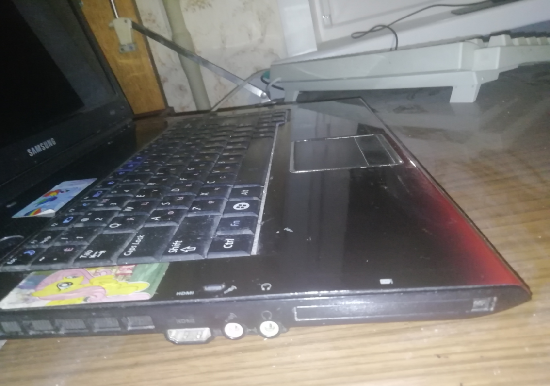 Он всё еще работает, но жизнь наложила на него свои отпечатки. У него треснула крышка, так что его нельзя перевозить - если закрыть экран, его не получится открыть.