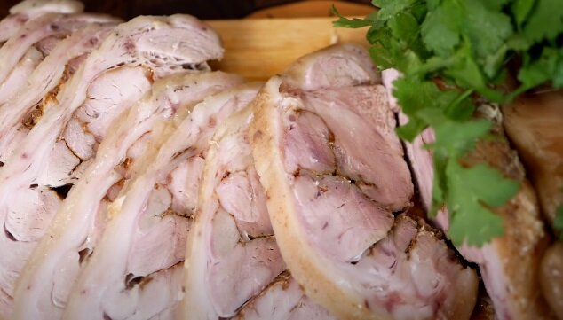И все - можно пробовать! Ароматная, нежная, домашняя ветчинка так и просится на язык! И напоследок еще одно блюдо из свинины - рулетики с грибной начинкой. Не потеряйте рецепт, это прекрасная закуска, которая получается всегда и у всех!