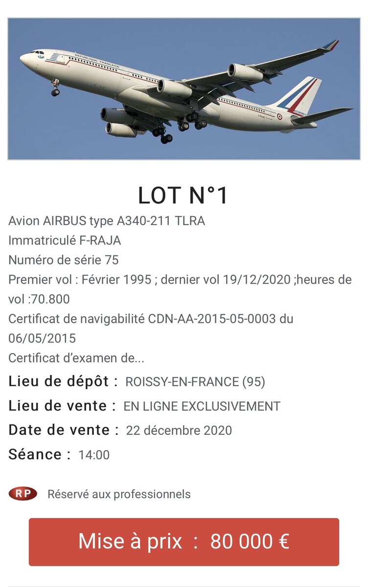 Франция объявила об аукционе на покупку двух правительственных Аэробусов-340, осуществляющих перевозку первых лиц республики. Начальная цена составит всего 80 тысяч евро за каждый самолет.
