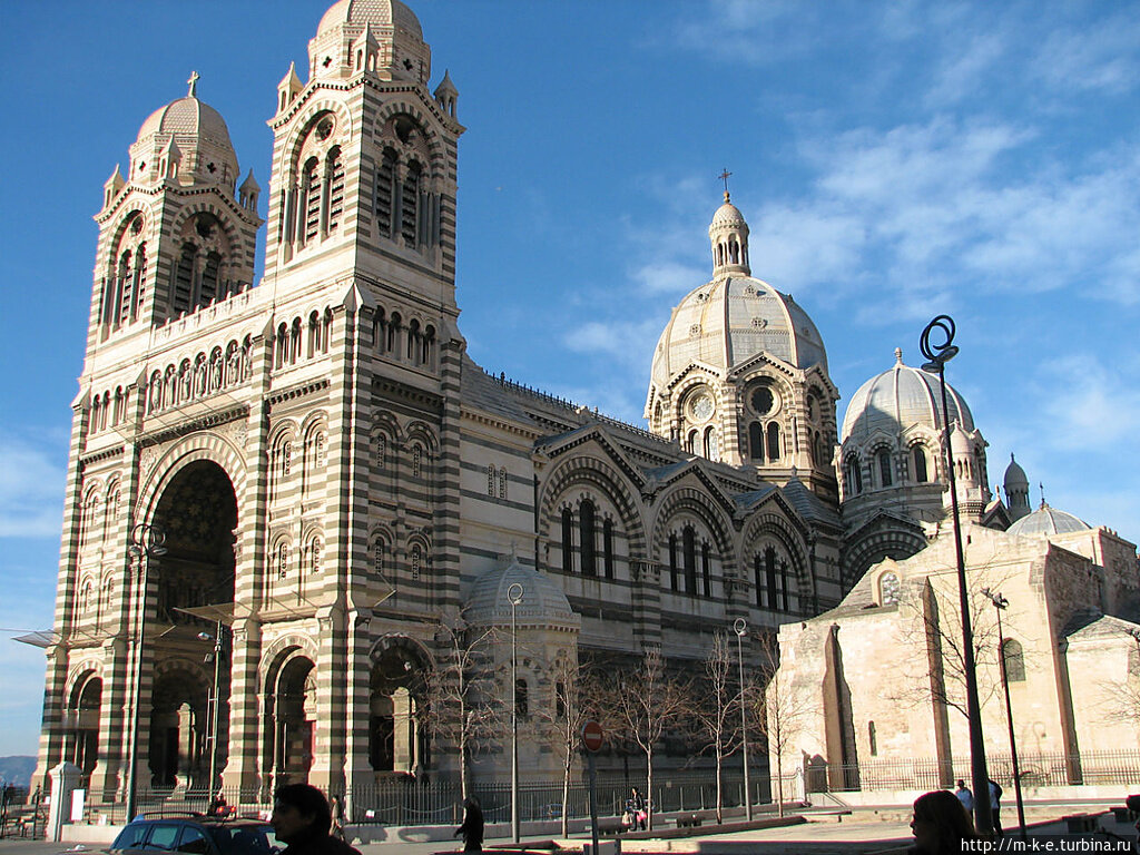 На площади de la Major возвышается Кафедральный собор, построенный из материалов присущих этой местности. Здание из белого и зеленого камня стоит рядом со Старым собором. Собором от которого веет древностью. Этот собор родом из 12 века, прозванный старым, носит имя la vieille Major. Здание из розового куроннского камня в плане имеет латинский крест и представляет собой прекрасный образец романской архитектуры Прованса. В 1852 году, чтобы освободить место под строительство нового собора, старое здание решили снести, однако жители Марселя и Французское общество по охране памятников воспротивились этому. В результате у «старого собора» убрали два пролета и колокольню, а бывший собор стал приходской церковью, которая функционировала до середины 20 века. Сейчас древнее сооружение закрыто на реставрацию. Вот так плавно перейдем в 1852 год, когда началось строительство Кафедрального собора. Первый камень в основание был заложен Наполеоном III. Строительство продолжалось 41 год. «Новый собор» стал самым большим французским собором, созданным со времён Средневековья, его здание может принять одновременно 3 000 человек. Архитектура собора (проект Леона Водуайе) сочетает в себе многие стили и направления: византийский стиль (купола, мозаики), романские и готические элементы. Здание собора состоит из монументального портала с двумя башнями и величественного нефа с капеллами. Перед тем как войти в собор обратим внимание на памятник Анри де Бельзюнса, епископа Марселя в период страшной эпидемии чумы в 1720. Размеры собора впечатляют. 142 метра в длину; башни возвышаются на 60 метров, центральный купол диаметром 17, метра достигает 70 метров в высоту. По обе стороны внешнего фасада возвышаются башни с куполами. Над портиком проходит галерея, связывающая башни; здесь расположены скульптуры, изображающие Христа (в центре), апостолов (Пётр и Павел) и святых, особо почитаемых в Провансе (Лазарь, Марта, Максимин, Мария Магдалина). Арка портала украшена сине-золотой мозаикой в стиле одного из мавзолеев Галлы Плацидии в Равенне. В верхней части портика над тройной аркой – небольшая роза, по обеим сторонам которой выполнены мозаичные символические изображения Иерусалима и Вифлеема. Над входными дверями установлены мраморные барельефы: в центре (главный вход) – коронование Богоматери, с восточной стороны – два грифона, охраняющие Древо жизни, а над западным входом – Агнец Апокалипсиса. Входим в церковь и видим огромное помещение с тремя гигантскими пролётами. Своды арок и опоры выполнены из камня и мрамора, светлый охристый оттенок чередуется с красным. Над главным пролетом свисают флаги. Высокие окна украшены витражами. В третьем пролёте нефа расположена скульптурная группа работы Огюста Карли «Вероника, протирающая лицо упавшего Иисуса». Свет в храм падает с 60-метровой высоты через восемь сдвоенных сводчатых окон, над которыми расположены круглые витражи-розы. Над каждой из боковых часовен трансепта расположен купол чуть меньшей высоты, чем центральный. В углах, образованных гигантскими опорами, размещены монументальные скульптуры четырех евангелистов работы марсельского скульптора Луи Ботинелли. В центре находится главный алтарь из каррарского мрамора, украшенный мозаикой работы Анри-Антуана Ревуаля. Над главным алтарём раскинулся балдахин с бронзовым куп