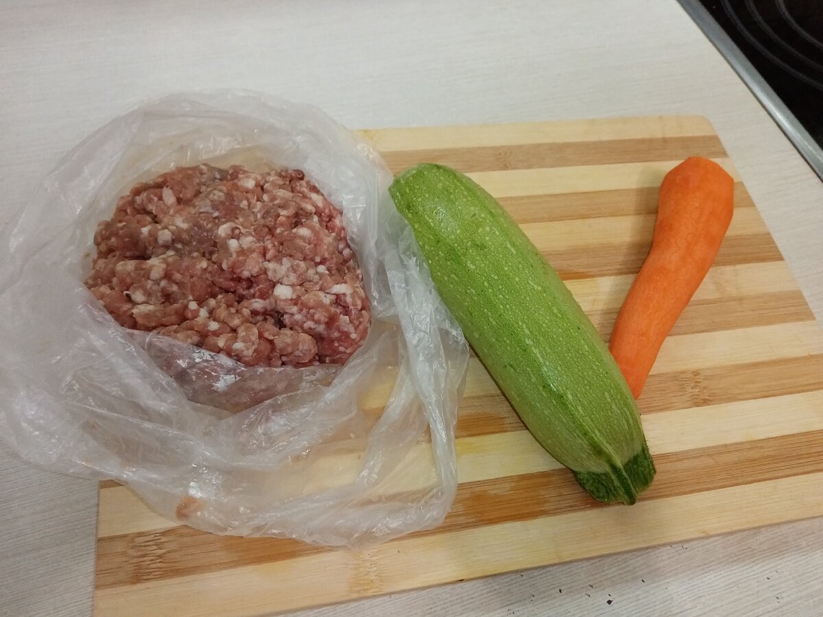 Нам понадобится один кабачок и морковка а так-же 250гр свиного фарша.