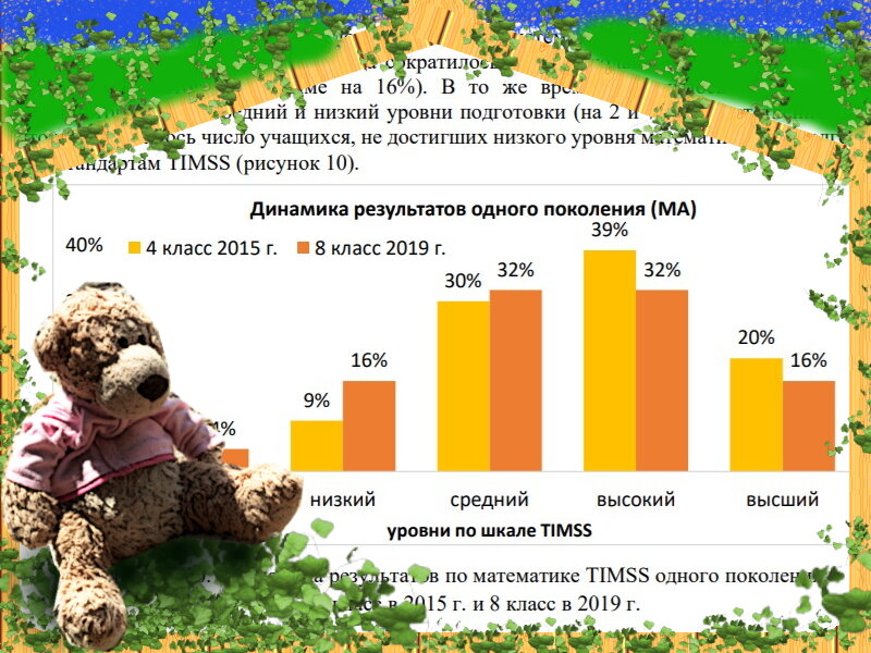 Подведены итоги международного исследования в области образования TIMSS-2019. Оно проводится один раз в 4 года и сравнивает уровень знаний школьников 4 и 8 классов из разных стран по естествознанию и математике. Россия участвует в исследовании с 1995 года. Всего в исследовании приняли участие 580 000 школьников из 64 стран мира. Результаты России рассчитаны на основе результатов: Четвероклассники были из 294 школ 43 регионов РФ. При этом 202 школы проводили тестирование в компьютерном виде, 92 - на бумаге. Восьмиклассники были из 296 школ 43 регионов РФ. Из них 204 школы проводили тестирование в компьютерном формате и 92 - на бумаге. Всего приняли участие 49 регионов РФ, в 37 были 4 и 8 классы, в 12 - только четвёртые или только восьмые. Общие результаты По сравнению с 2015 годом четвероклассники улучшили свои результаты, поднявшись на одну ступень, а восьмиклассники поднялись сразу на две ступени по естествознанию, но не повысили уровень по математике. Преобладающий вид познава