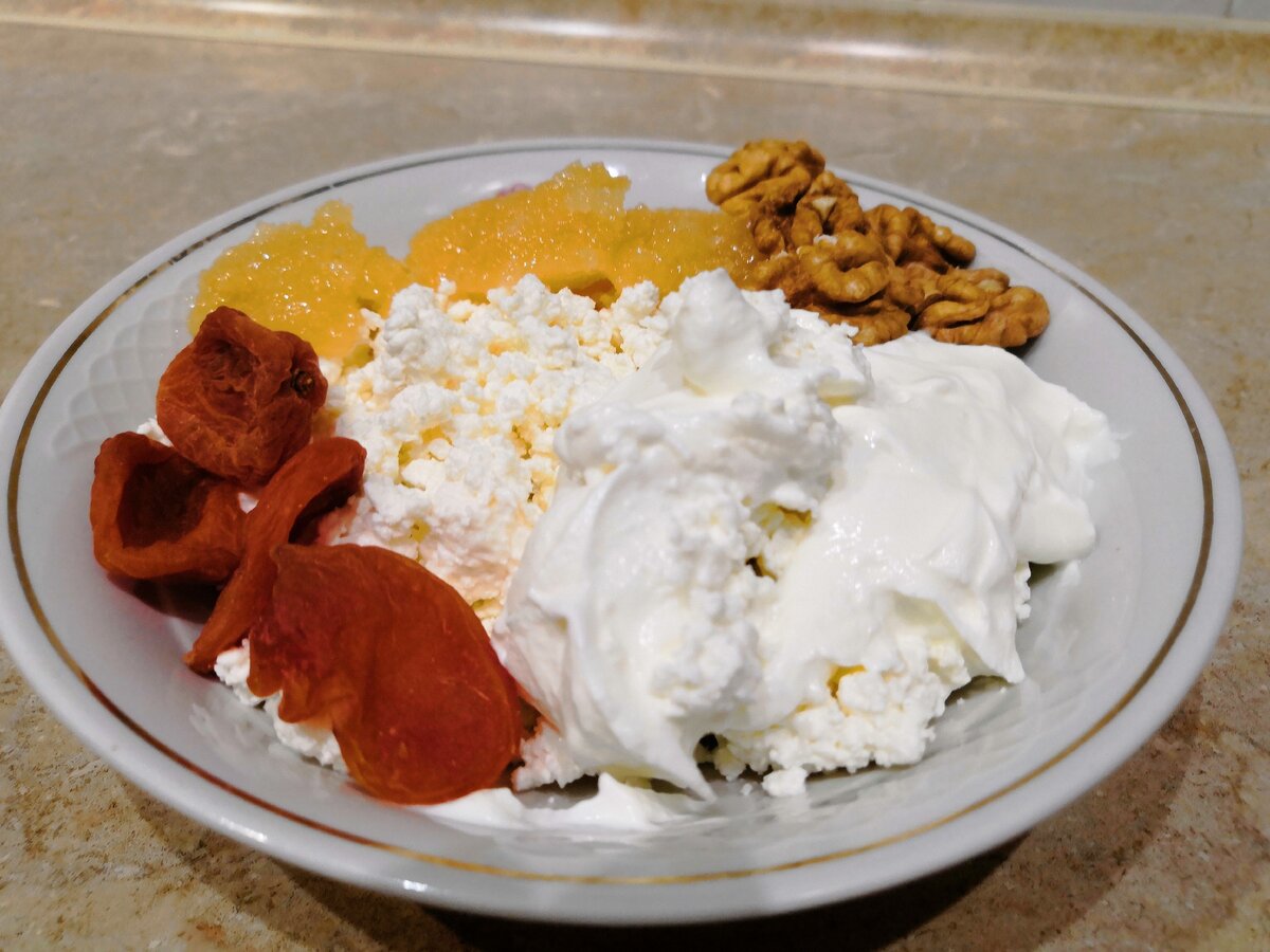 Лёгкий и калорийный завтрак - Творог со сметаной , курагой, грецким орехом и мёдом.