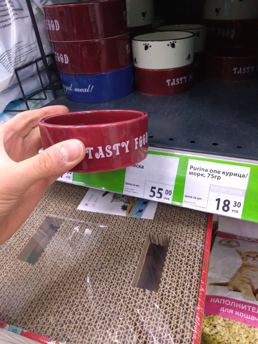 Открывает наш топ продукция из отдела для котов. Как вы можете увидеть - это кошачья миска за 55 рублей.