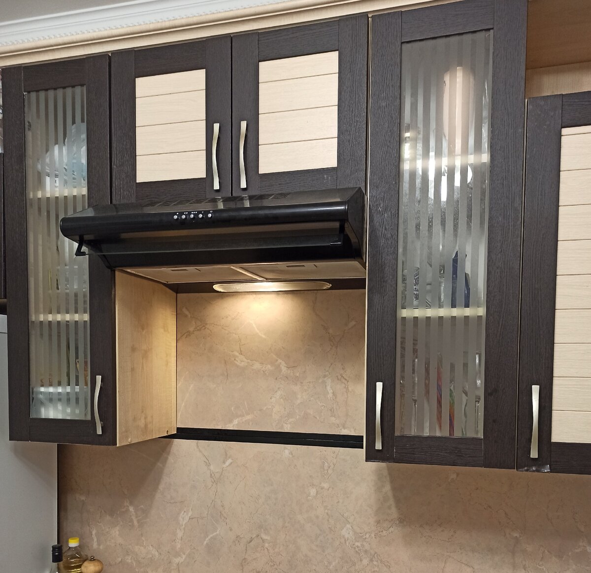 Нашей кухне уже восемь лет, мы её заказывали когда въезжали в квартиру в новом доме, кухня сделана на заказ, основные стенки из ДСП, в принципе они не в плохом состоянии, фасады из ламинированного МДФ, тут дела похуже, местами отслоилась пленка. В этом году решили её обновить, поменять столешницу, раковину, газовую варочную панель, обновить и перекрасить фасады ящиков и шкафчиков.