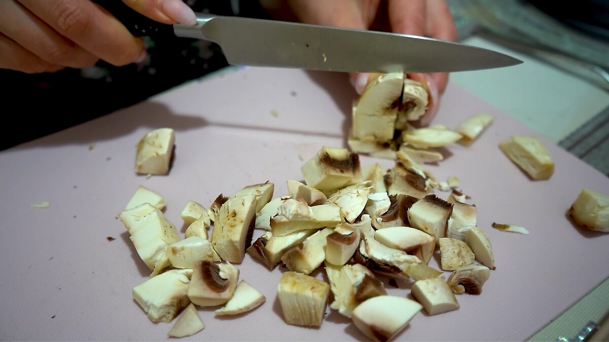 Шампиньоны нарезать кубиками и отправить обжариваться в сухой сковороде.